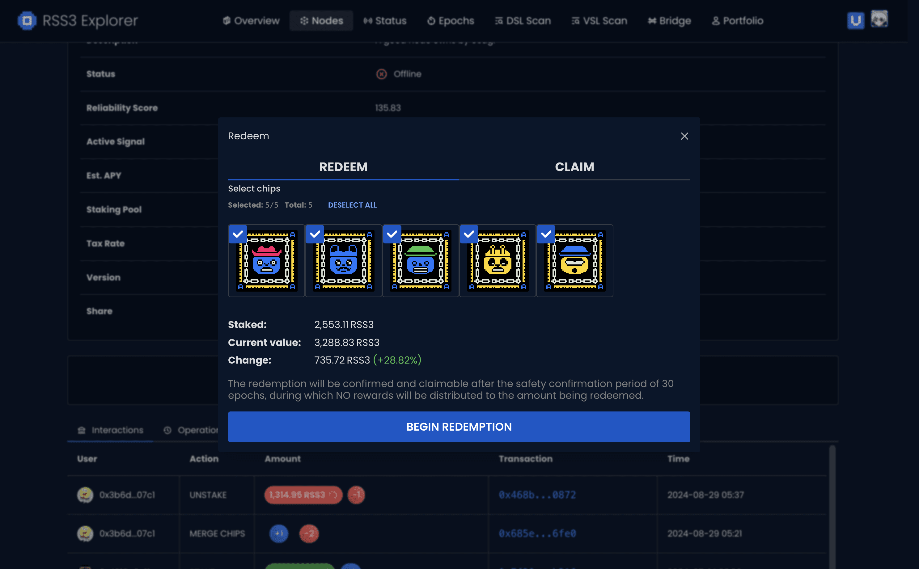 Redemption is the process of converting your Chips back to $RSS3 tokens. This guide will walk you through the steps to redeem your Chips. This process is permissionless and can be done at any time by Chip owners.